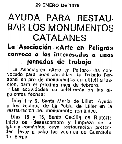 El día 27 d'octubre de 1974, un grup format per Ramon Pujals, Josep Vilella, Filibert Cisneros i Àngel Francàs, es varen organitzar i, amb el suport de l'Ajuntament, Bankunión i Asland S.A., la col.laboració personal del jovent de La Pobla, de Guardiola de Berguedà i de la joventut Salvem l'Art, de Barcelona, es va iniciar una restauració que va durar, aprofitant diumenges i dies festius, gairebé dos anys. S'aconseguí fer la teulada nova, posar la porta principal i treure el guix de bona part de les parets.