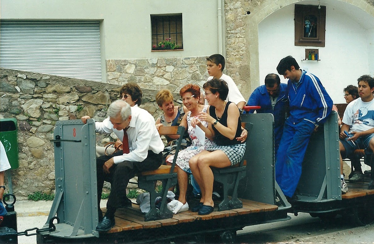 Hi podem veure a alguns dels iniciadors del Carrilet Tùristic: Miquel Fajula (d'esquena), el Ramon Saus (fill), Ramon Saus (pare) i el Carmelo. Any 1989.